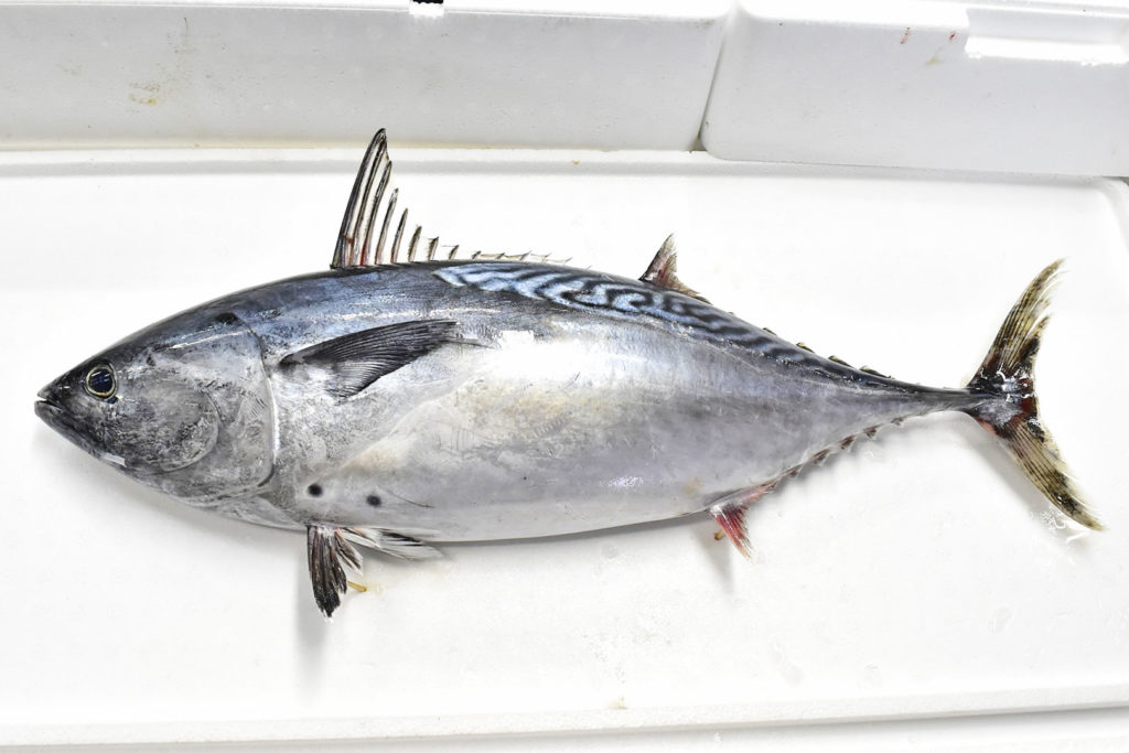 師走の魚類市場 その2 初冬の大型スマ(ほしがつお)、クロマグロ同様脂ノリノリです。開聞岳冲の定置網に入り始めました。 スマ(ほしがつお)の刺身 -